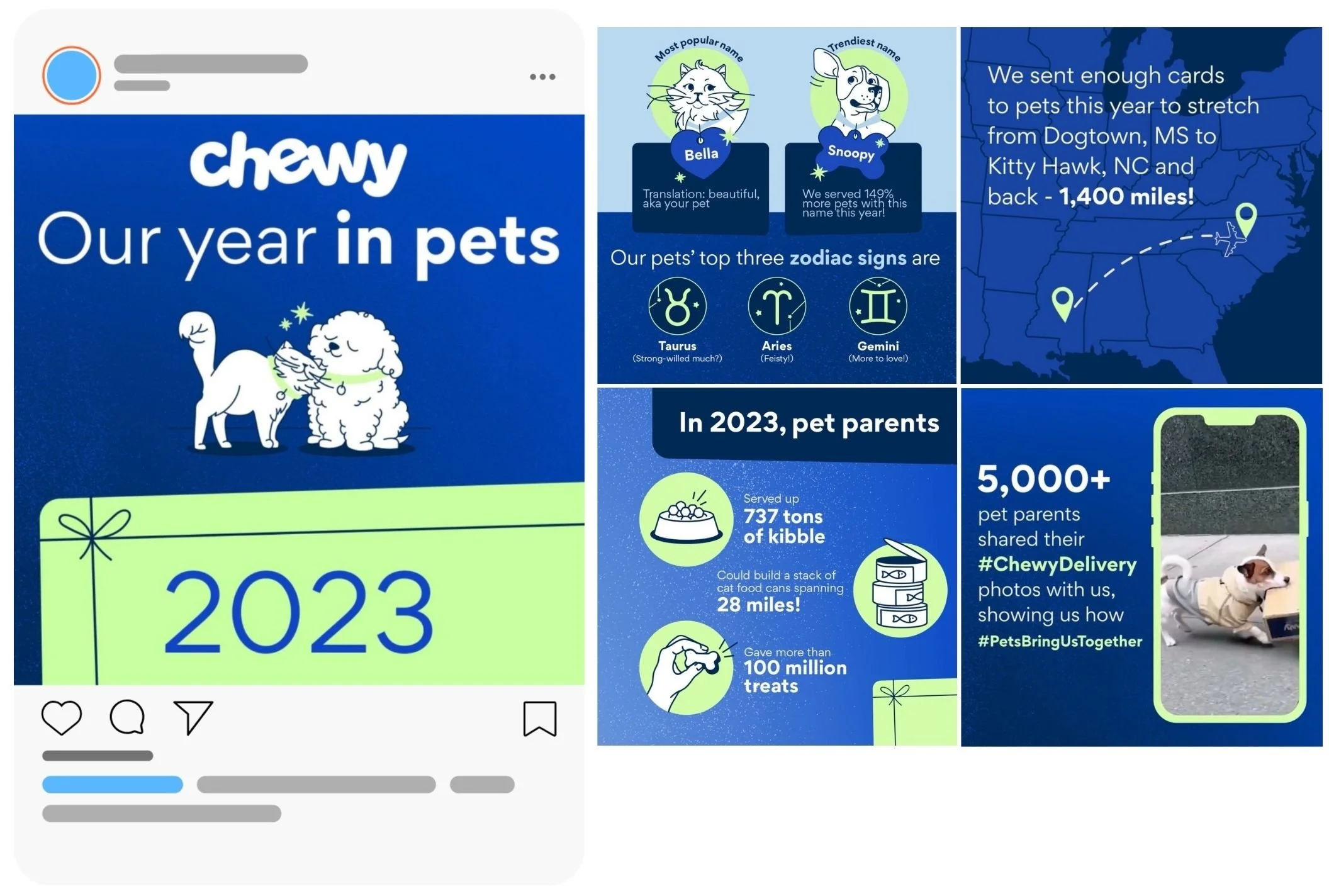 Chewy’s Year in Pets 2023 is a community focused campaign that celebrates pet parents while driving engagement, traffic, and revenue. Inspired by year-in-review moments like Spotify Wrapped, the campaign centers on a compelling infographics for blog posts and social media. Together, they highlight playful yet meaningful data driven insights into pet-parent trends and Chewy’s impact for 2023